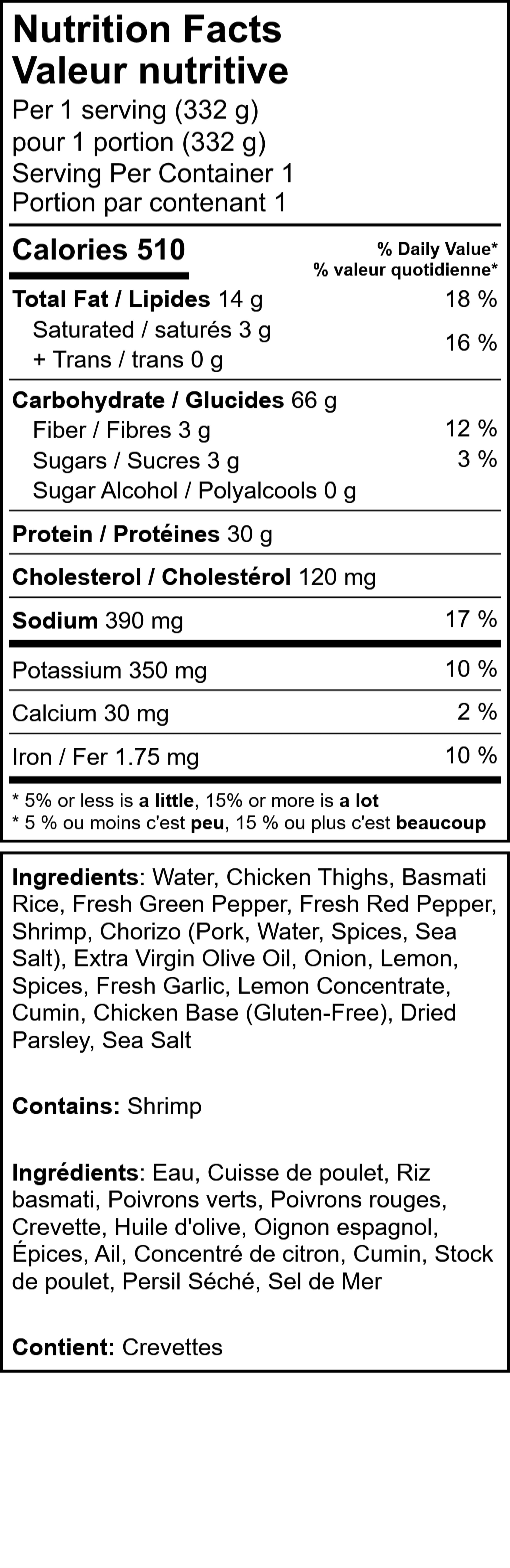 Experience the vibrant flavours of our Spanish Paella on Basmati Rice, perfect for a balanced, healthy lifestyle. Savour tender chicken thighs, succulent shrimp, and spicy chorizo combined with fresh green and red peppers, onions, and aromatic spices like turmeric, cumin, and garlic. Paired with fragrant basmati rice, this dish offers the perfect balance of healthy carbs and good protein. Made entirely from scratch with wholesome ingredients, every bite leaves you feeling satisfied, energized, and nourished. Enjoy a taste of Spain that proves healthy eating can be both delicious and fulfilling!