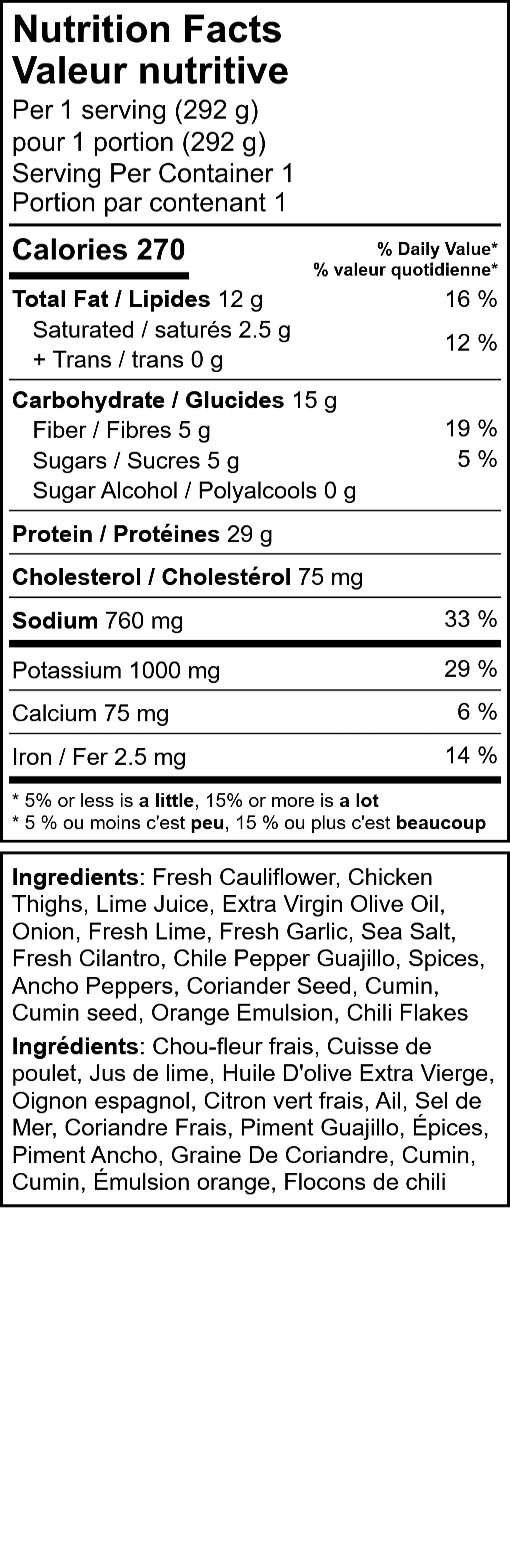 Smoky, zesty, and packed with flavour, our Pollo Asado is marinated in a bold blend of guajillo and ancho chiles, garlic, lime, and spices—then roasted until juicy and tender. It’s paired with herbed cauliflower rice tossed in fresh cilantro and lime for a bright, satisfying bite. Low in carbs and calories, but big on taste.