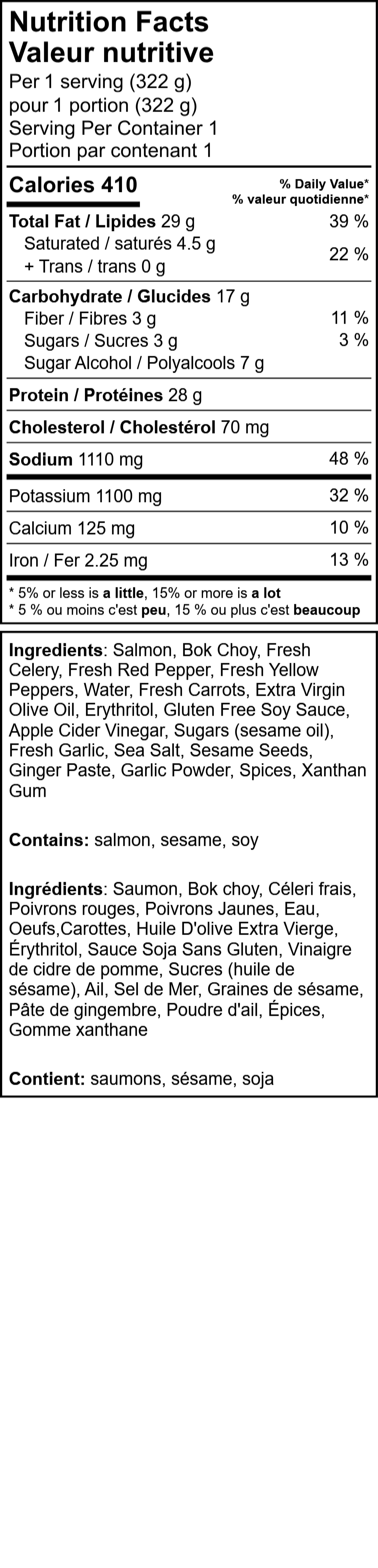 Treat yourself to the vibrant flavours of our Teriyaki Salmon with Stir-Fried Vegetables, a dish designed to delight while fitting perfectly into a low-carb, keto-friendly lifestyle. Enjoy perfectly cooked salmon, glazed with a low-carb teriyaki sauce sweetened without sugar and enhanced with a hint of sambal oelek for that extra kick. This main course is paired with a colourful medley of stir-fried vegetables including bok choy, zucchini, red cabbage, and red peppers, all sautéed in organic coconut oil and extra virgin olive oil. Infused with fresh lemon juice and garnished with chives, this meal is a delicious way to stay on track while indulging in your love of Asian cuisine.