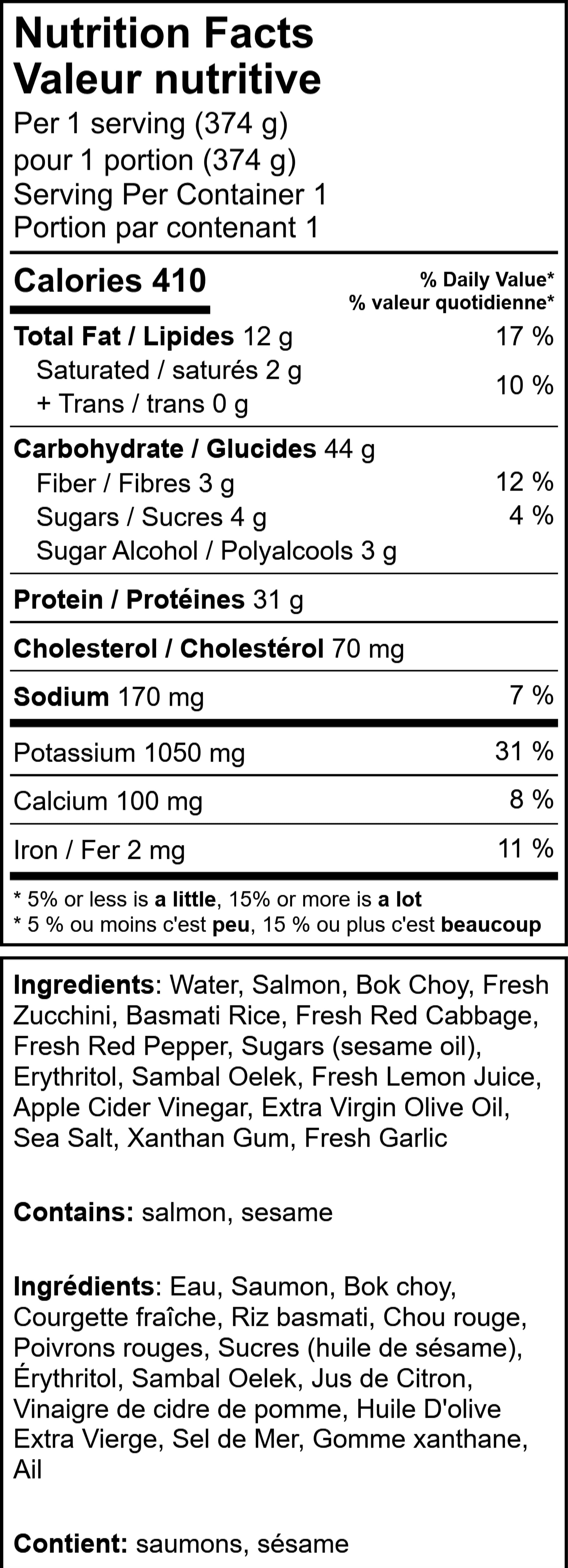 Enjoy a flavourful seafood feast with our Salmon with Sweet Chili Glaze & Sesame Stir-Fry on Basmati Rice! A fresh salmon fillet is coated in our house-made, sugar-free sweet chili glaze, then paired with a vibrant mix of zucchini, bok choy, purple cabbage, and red pepper. Served over fluffy basmati rice, this dish delivers the perfect balance of sweet, savoury, and satisfying. Made with real, wholesome ingredients, it’s a nourishing meal that doesn’t compromise on flavour!